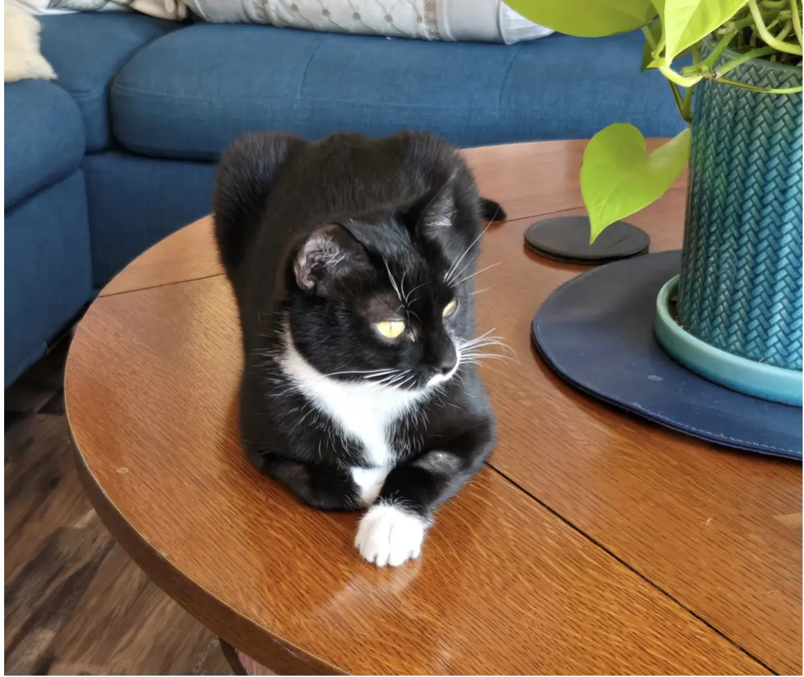 Pistachio is a chunky, loving, part time model who loves to play with shoelaces, look out the window, and see her wild friends (the birds)! Pistachio was found in the street and when they took her to the vet, she was super thin and happened to have a chip in her. The vet called the number that the chip was linked to, and the people said they don’t own a cat! After that day Pistachio’s new life began!
